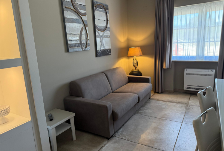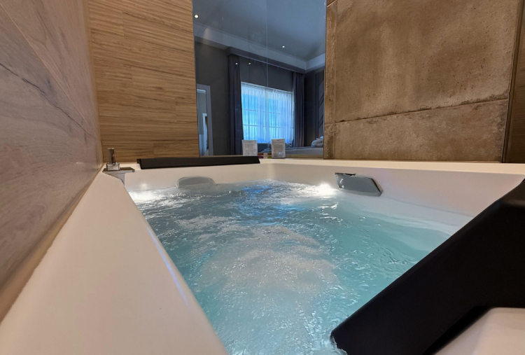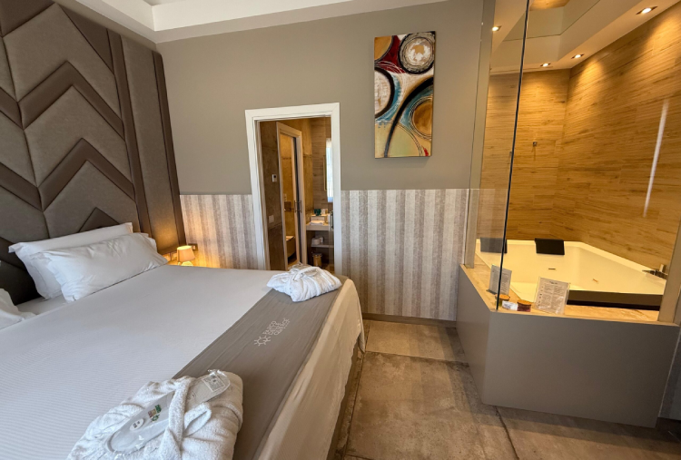 La suite è composta da una zona living arredata con un raffinato divano, una camera con letto matrimoniale King Size e una elegante zona bagno a vista suddivisa in area sanitari, doccia e vasca idromassaggio. Un romantico ambiente con finestre esaltate dalla vista sugli uliveti secolari. Il letto matrimoniale con materasso King Size tra i piu’ comodi nell’hotellerie garantisce massimo relax e quasi una sensazione di massaggio corredato da cuscini per un riposo di altissima qualità. Il corredo bagno, è compreso di accappatoi in morbida spugna, sanificati e profumati dalla lavanderia interna. Completano la suite, due tv 4k con canali dtv e satellitari, wi-fi e un frigobar ricchissimo di snack e bevande.