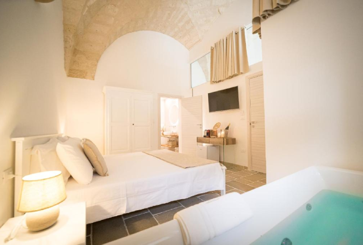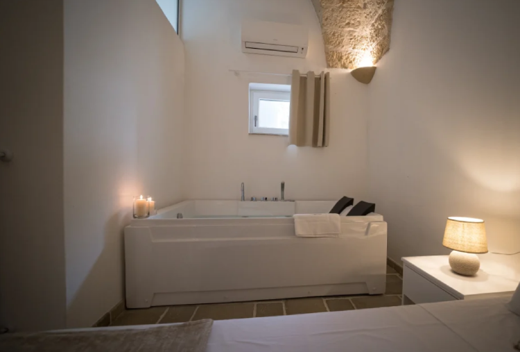 La Spa Suite presenta un arredamento elegante e raffinato che combina elementi moderni con tocchi di tradizione locale, creando un ambiente accogliente e sofisticato. Le pareti in pietra leccese, tipiche della regione, aggiungono un tocco di autenticità e calore all'intero spazio. Al centro della suite si trova la piscina riscaldata, il vero gioiello della struttura. Con la sua acqua cristallina e la temperatura costante, questa piscina è perfetta per un bagno rilassante in qualsiasi stagione dell'anno. Le luci soffuse e l'illuminazione subacquea creano un'atmosfera magica, ideale per immergersi in un momento di puro relax. Intorno alla piscina, comode chaise longue invitano a distendersi e lasciarsi coccolare dal dolce suono dell'acqua che scorre. Accanto alla piscina, il bagno turco rappresenta un rifugio di benessere e rigenerazione. Questo ambiente, contribuisce a liberare le vie respiratorie e a purificare la pelle. Il vapore caldo avvolge il corpo, favorendo la circolazione e rilassando ogni muscolo. È il luogo ideale per prendersi una pausa e ritrovare il proprio equilibrio interiore.
