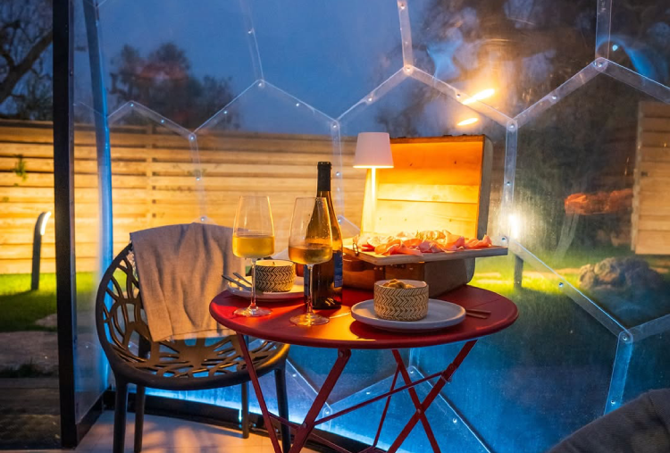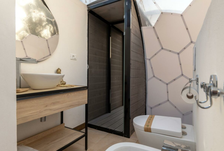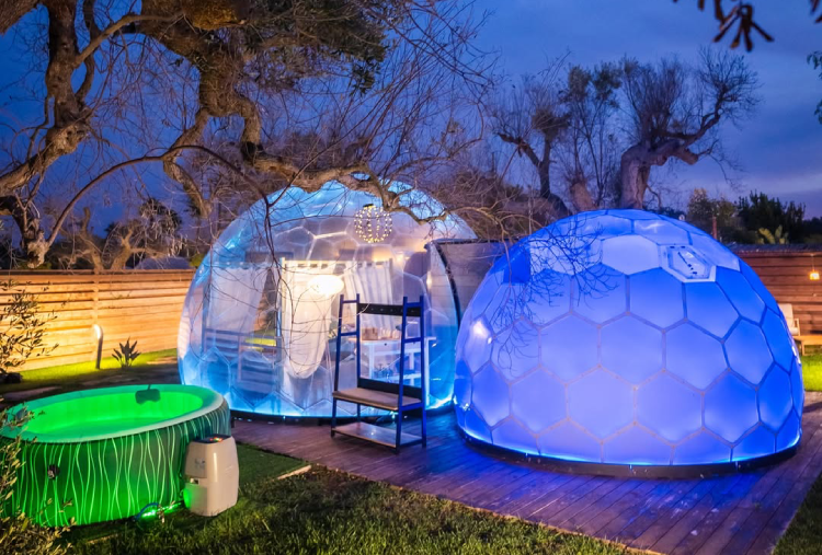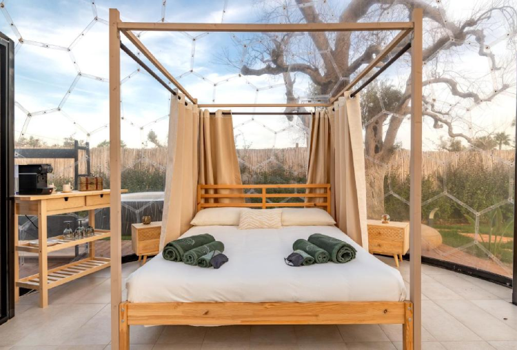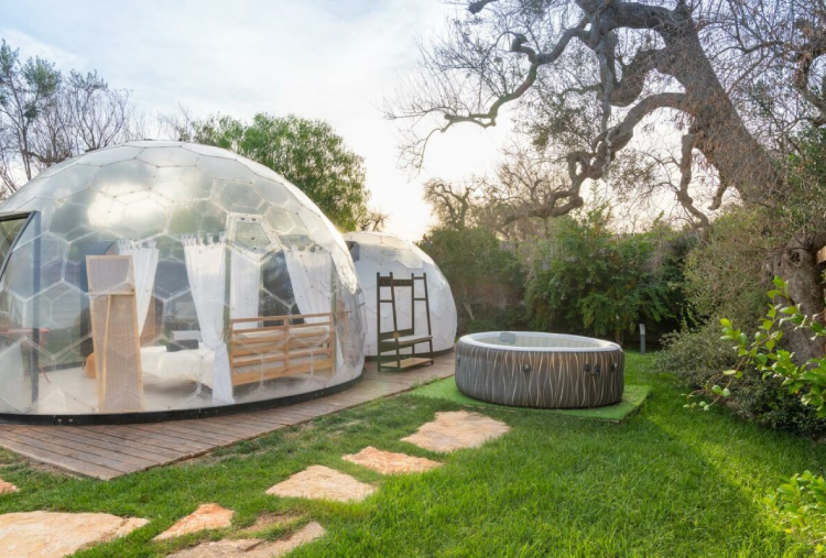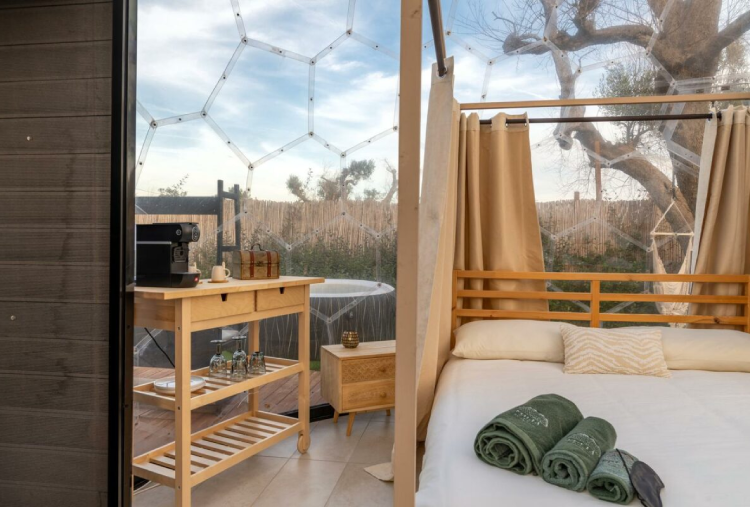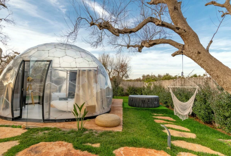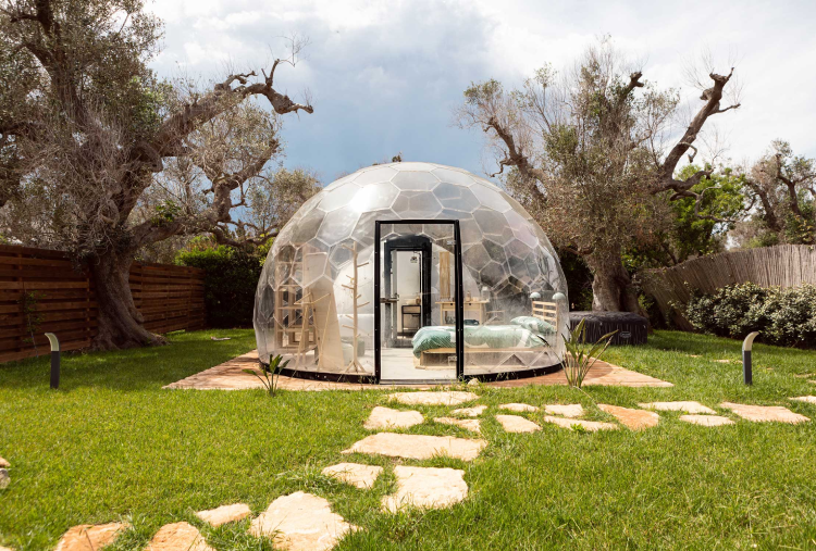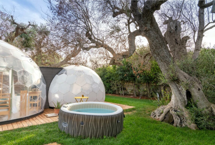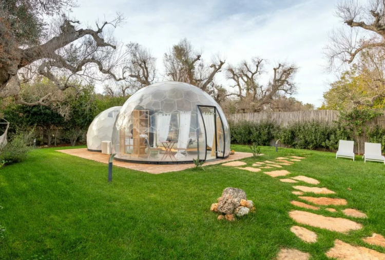 Le 5 Cupole a forma di "Bolla" si distinguono per l’atmosfera avvolgente e naturale, con mobili in legno o con design contemporanei ispirati alla bellezza della natura. Ogni Cupola è concepita come un nido d’amore, creando un ambiente romantico e intimo . Dispongono di bagno privato, kit caffè e kit cortesia, Wi-Fi e climatizzatore. Ogni dettaglio è stato pensato per mantenere una connessione continua con l’ambiente esterno, offrendo al contempo un’esperienza di lusso moderna e accattivante. Le pareti trasparenti permettono di ammirare il paesaggio circostante, dagli ulivi secolari alle stelle scintillanti di notte, creando un senso di continuità tra l’interno e l’esterno. L’area privata esterna è arredata con tavolo e sedie, una lussuosa jacuzzi privata, ideale per rilassarsi sotto le stelle o godersi un bagno caldo al tramonto e lettini, diventando il luogo ideale per gustare la colazione o un aperitivo. La colazione e l’aperitivo rispecchiano la ricchezza della cultura pugliese, utilizzando ingredienti locali e a km 0.