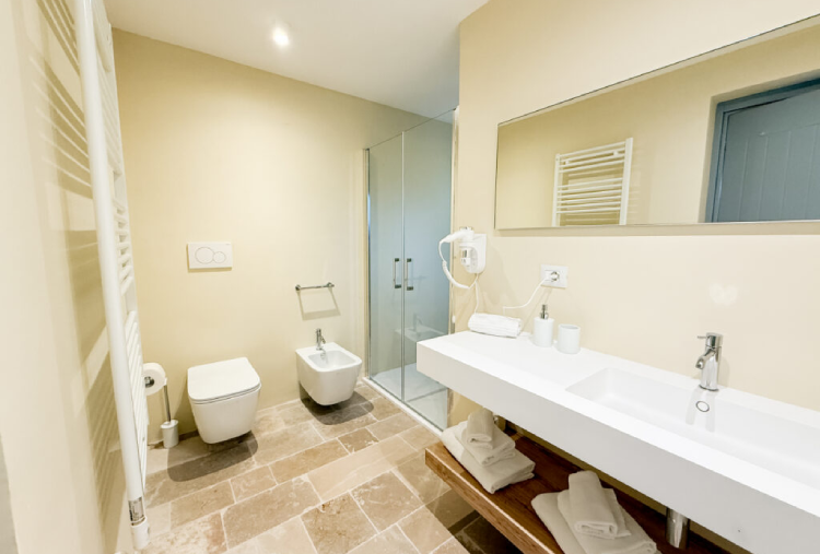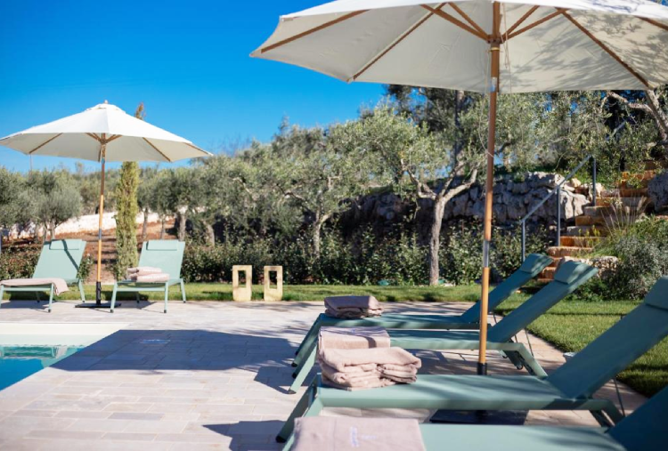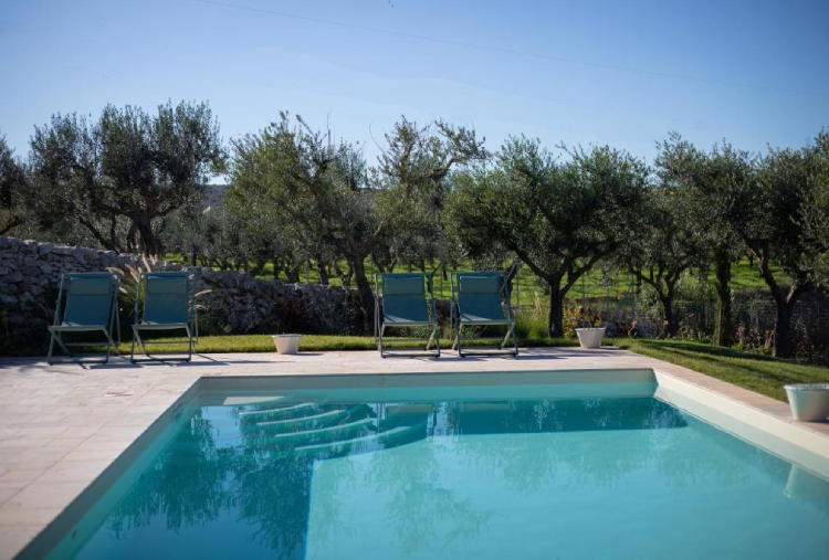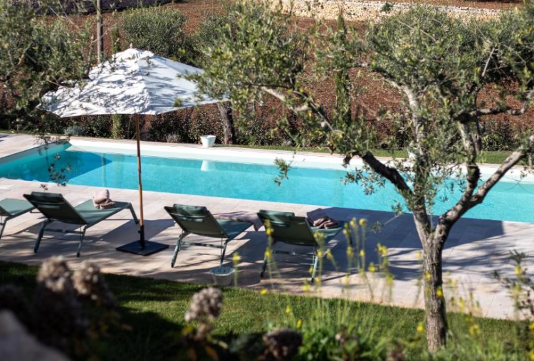 La piscina esterna è progettata con linee essenziali e materiali che richiamano la tradizione pugliese, armoniosamente inserita nel giardino mediterraneo. Fiore all'occhiello del borgo, la meravigliosa piscina permetterà di far vivere all'ospite un relax assoluto, tra la natura circostante, tra lusso e comfort.