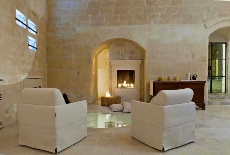 Le camere sono rigorosamente monocromatiche, caratterizzate da tonalità castane che vanno dal beige della pietra al marrone del legno e del ferro cortèn. La terra, la chianca, il colore naturale della pietra diventano parete, soffitto e seduta. La ricerca costante di un legame tra gli ambienti interni e il paesaggio circostante ha dato vita al gioco della mescolanza della pietra locale, del legno e del ferro che si ripete in ogni camera con differenti proporzioni seguendo un disegno lineare ed essenziale. Elementi poveri, solitamente associati ad uno stile rustico, assumono leggerezza e modernità. Una luce intensa filtra dalle porte d’ingresso, sapientemente lavorate a mano, che attraverso le chiare tende di lino invade il primo ambiente di ogni camera destinato a salotto e area relax. Merita una menzione speciale la Suite con Spa privata, un luogo affascinante dove il tempo si ferma e la pietra racconta, dove poter vivere la magia dei "Sassi" in una suite pensata per rigenerare corpo e anima.