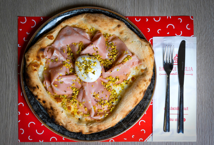 Pizza a scelta (Ad es. bocconcini di bufala, cardoncelli e guanciale croccante; crema di zucca, veli di capocollo di Martina Franca, burratina e noci; crema di rape, zampina sbriciolata e caciocavallo podolico);